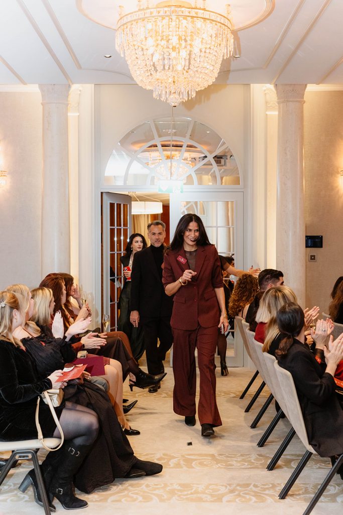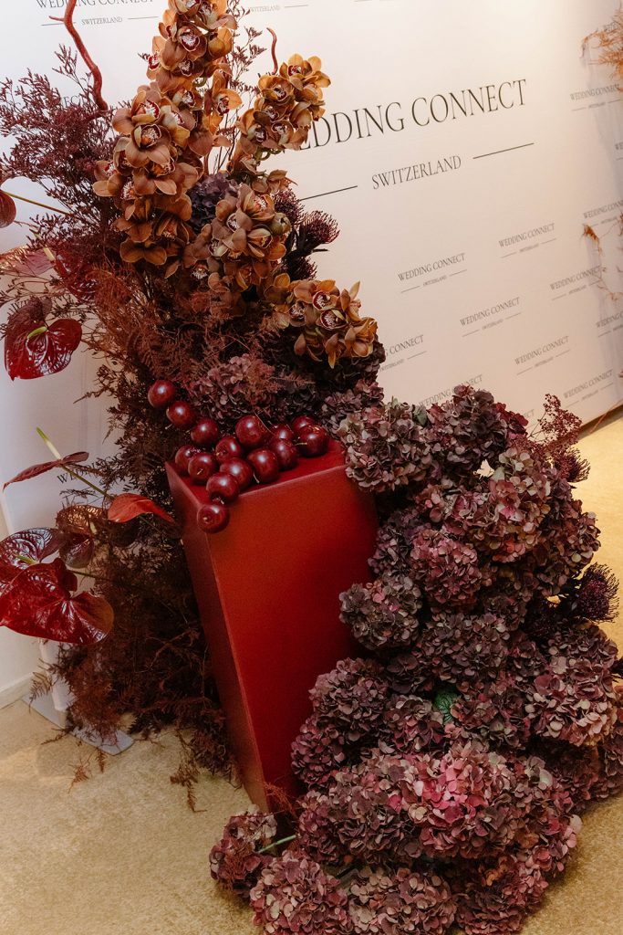 Das gesamte Event stand unter einem klaren Farbkonzept: Tiefes Dunkelrot, edles Bordeaux, warme Chocolate- und Espresso-Nuancen, ergänzt durch Schwarz und goldene Akzente. Diese Komposition verlieh dem Ambiente einen kraftvollen, zugleich eleganten Charakter und spiegelte sich in einem stilvollen Business-Look wider. Der Dresscode der Gäste griff diese Farben auf und verlieh dem Abend eine stilvolle und zugleich moderne Atmosphäre. Auch die Papeterie, die floralen Elemente auf der Bühne und die Dekoration waren in diesen Farben gestaltet, sodass sich ein harmonisches Gesamtbild ergab. Besonders schön war die Möglichkeit, selbst kreativ zu werden: Wir durften Sträuße in den Burgundy-Farben binden, was den Abend zusätzlich bereicherte und die Farbwelt noch stärker erlebbar machte.